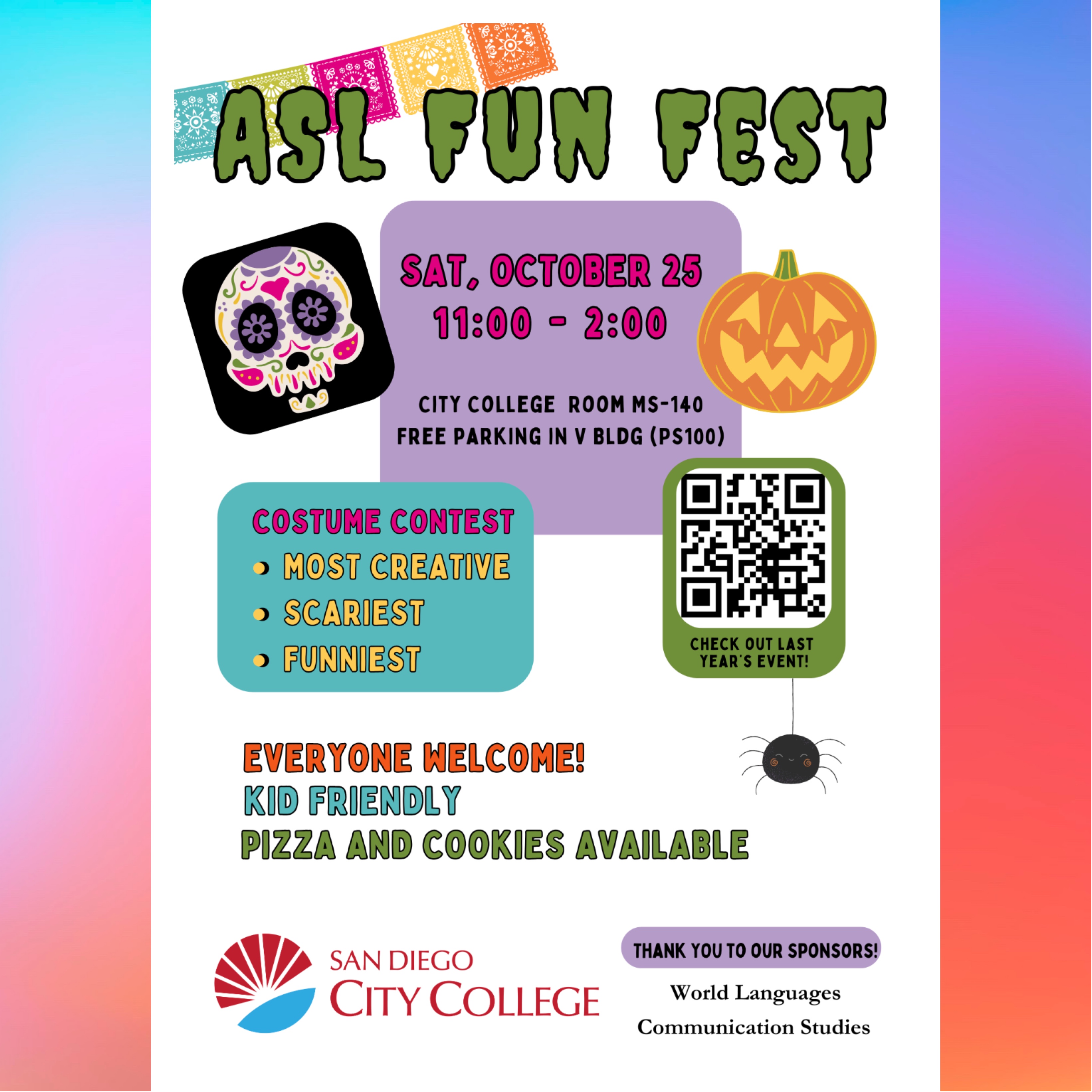 ASL Fun Fest event is hosted by San Diego City College ASL Club. Event Details: Who: Everyone (students / non-students / learners / anyone) is welcome to join. When: Saturday, October 25, 2025. Time: 11:00 AM - 2:00 PM. Where: San Diego City College, Room MS-140. 1313 Park Boulevard,. San Diego, CA 92101. Parking: Free parking in V BLDG (PS100). Attached is the map. Costume Contests: most creative, scariest, and funniest. Kid-friendly. Pizza and cookies. The QR code on the flyer which links to information (YouTube video with ASL and CC) about last year’s ASL Fun Fest event.